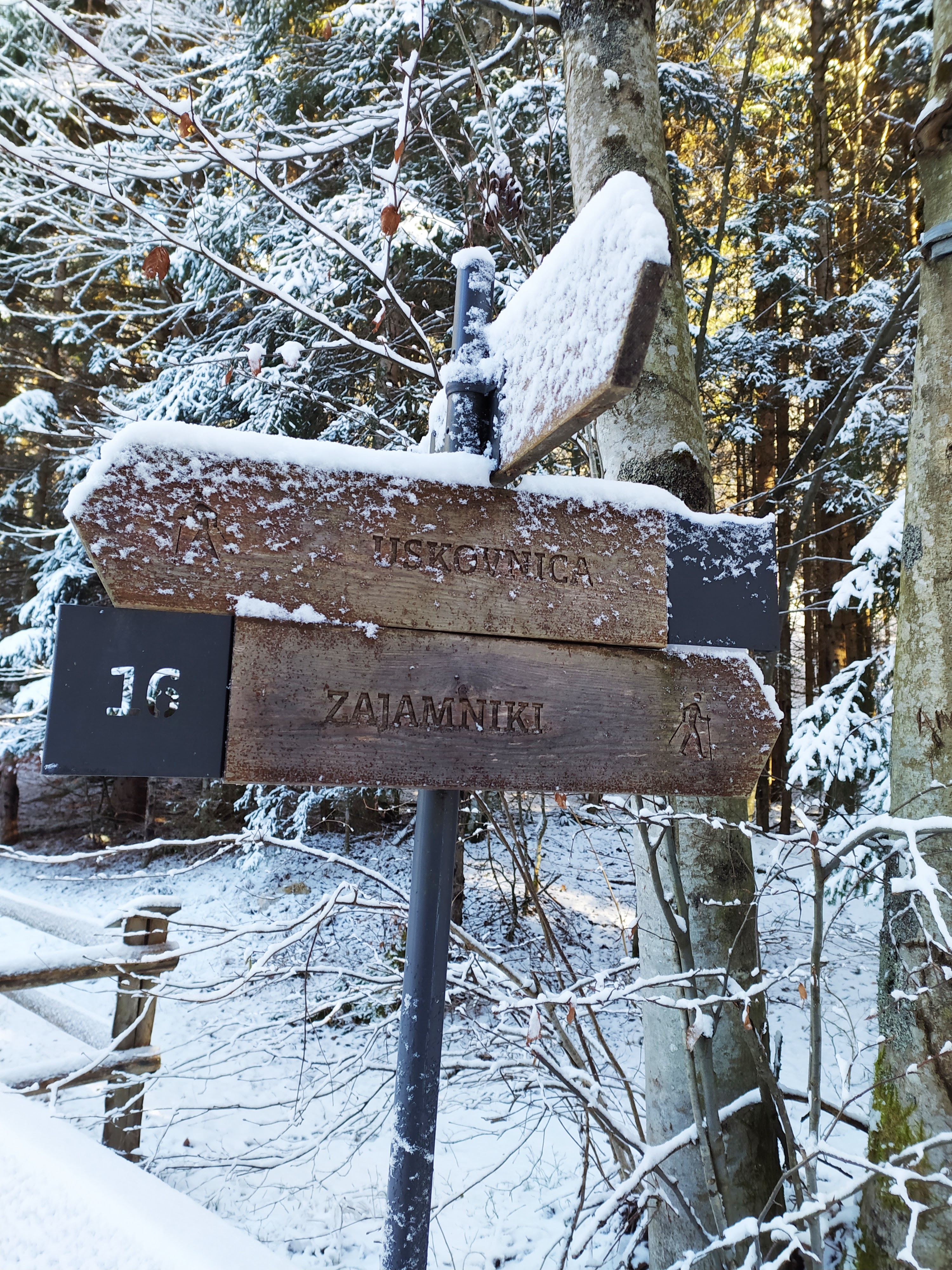 Nadaljujem naprej in pridem do kolovoza, ceste, kjer me tabla usmeri desno (levo Uskovnica).